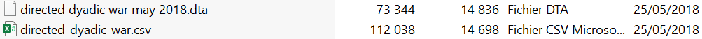 “The dyadic war dataset is built and fully compatible with the dyadic MID dataset (Maoz et al. 2019). It provides dyadic records of interstate wars over the period of 1816-2010, with a dyad-year unit of analysis. The dataset contains several innovations and changes compared to the war or MID datasets.” (codebook, p. 1)